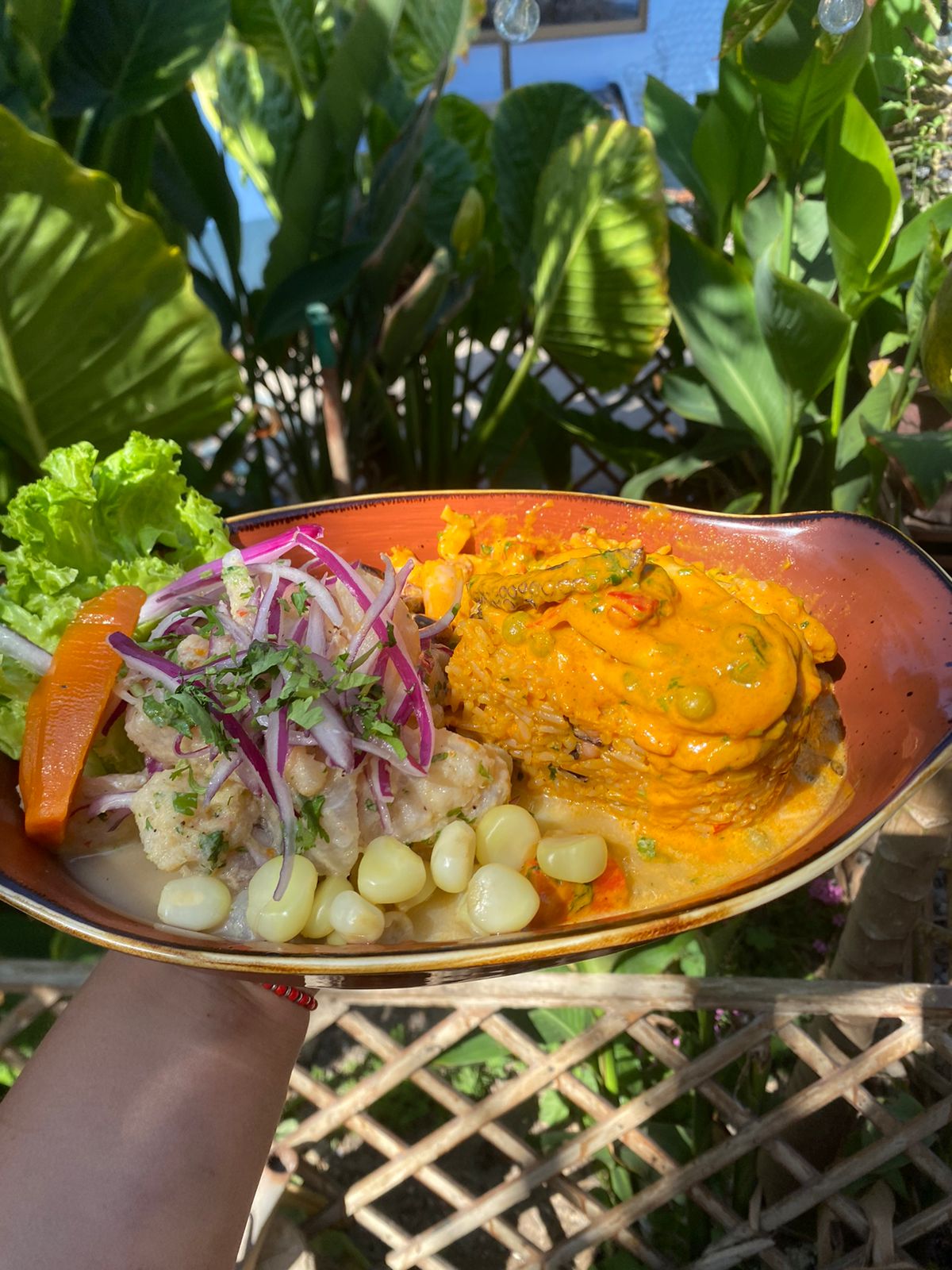 – Trilogía Marina.(ceviche, arroz con mariscos y chicharrones de pescado) $18.000